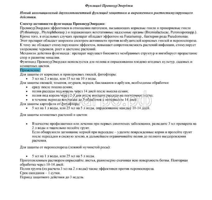 Фунгицид Превикур Энерджи используется для полива и опрыскивания плодово-ягодных культур, садовых и комнатных цветов.