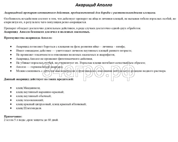 * Аполлоконтролирует как яйца клещей, так и молодые подвижные стадии их развития, обладает высокой продолжительностью токсического воздействия (не менее 30 суток).
