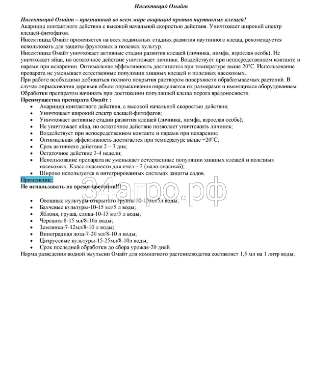В комплексе это приводит к тремору, паралича и изменения поведения клещей. Благодаря высокой эффективности Омайта против всех подвижных фаз клещей и фумигантного эффекта при высоких температурах личинки клещей, только появились, прекращают питания и погибают.