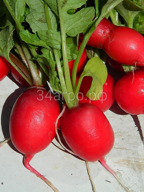 Растение относится к семейству крестоцветных. Этот сорт отличается ранним созреванием корнеплодов и высокой урожайностью. Редис имеет привлекательный внешний вид. Плоды ровные, круглые, блестящие, ярко-красного цвета. Мякоть белая или нежно-розовая. Кожица тонкая. Сорт ценится за свои уникальные вкусовые качества. Корнеплоды сочные, нежные, полностью отсутствуют горечь и острота. Сорт рекомендован для детского меню.